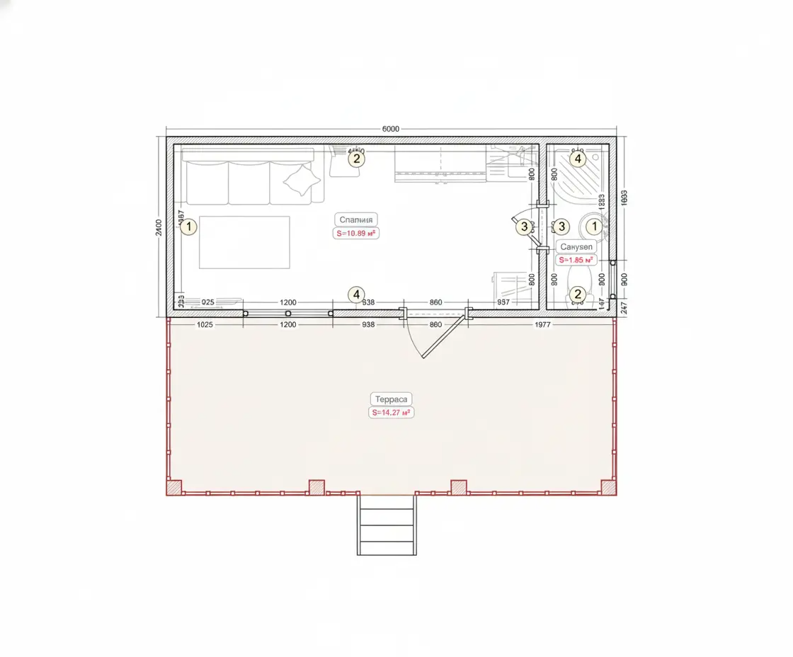 - Дополнительная перегородка с межкомнатной дверью под с/у, тамбур или комнату