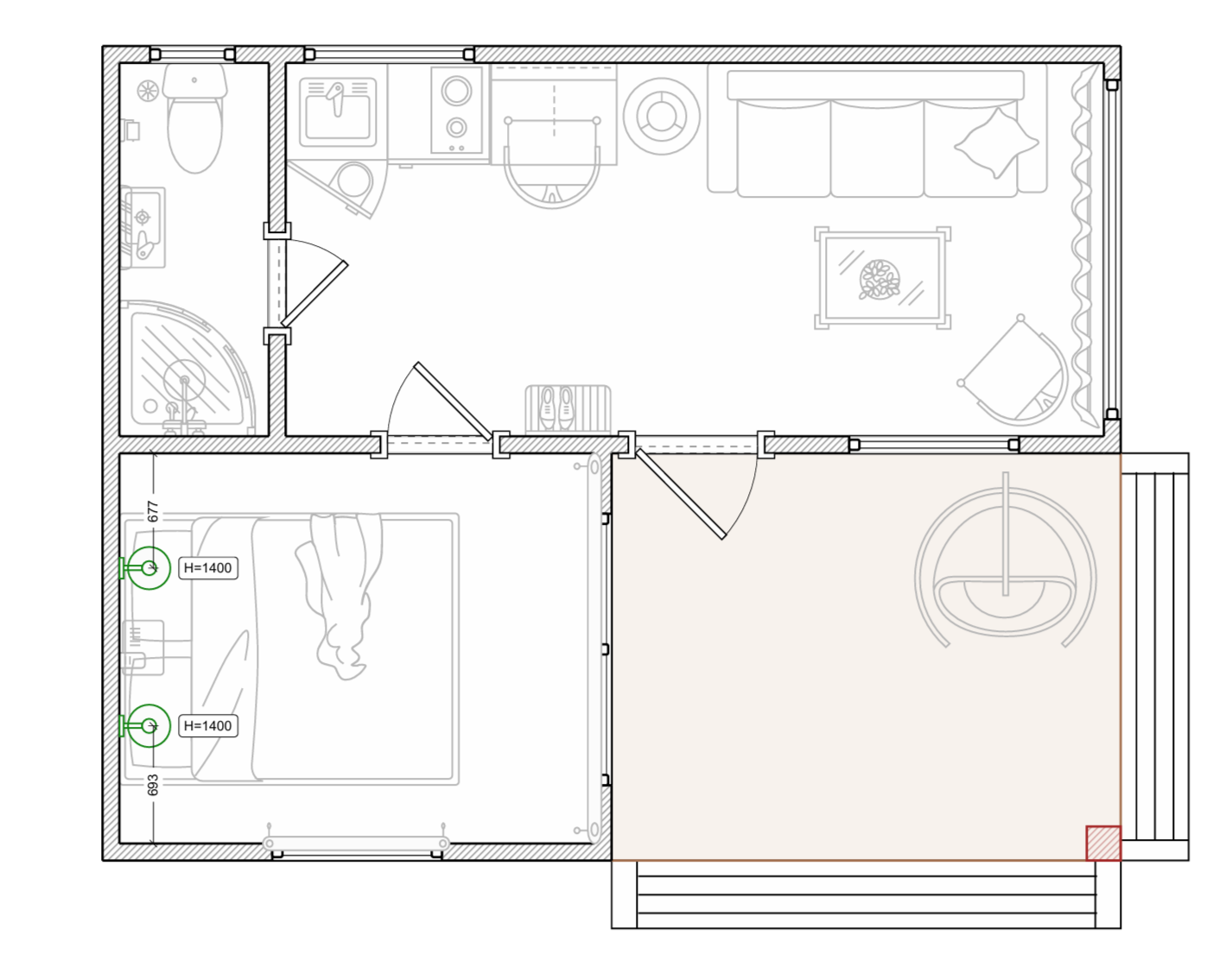 - Дополнительная перегородка с межкомнатной дверью под с/у, тамбур или комнату