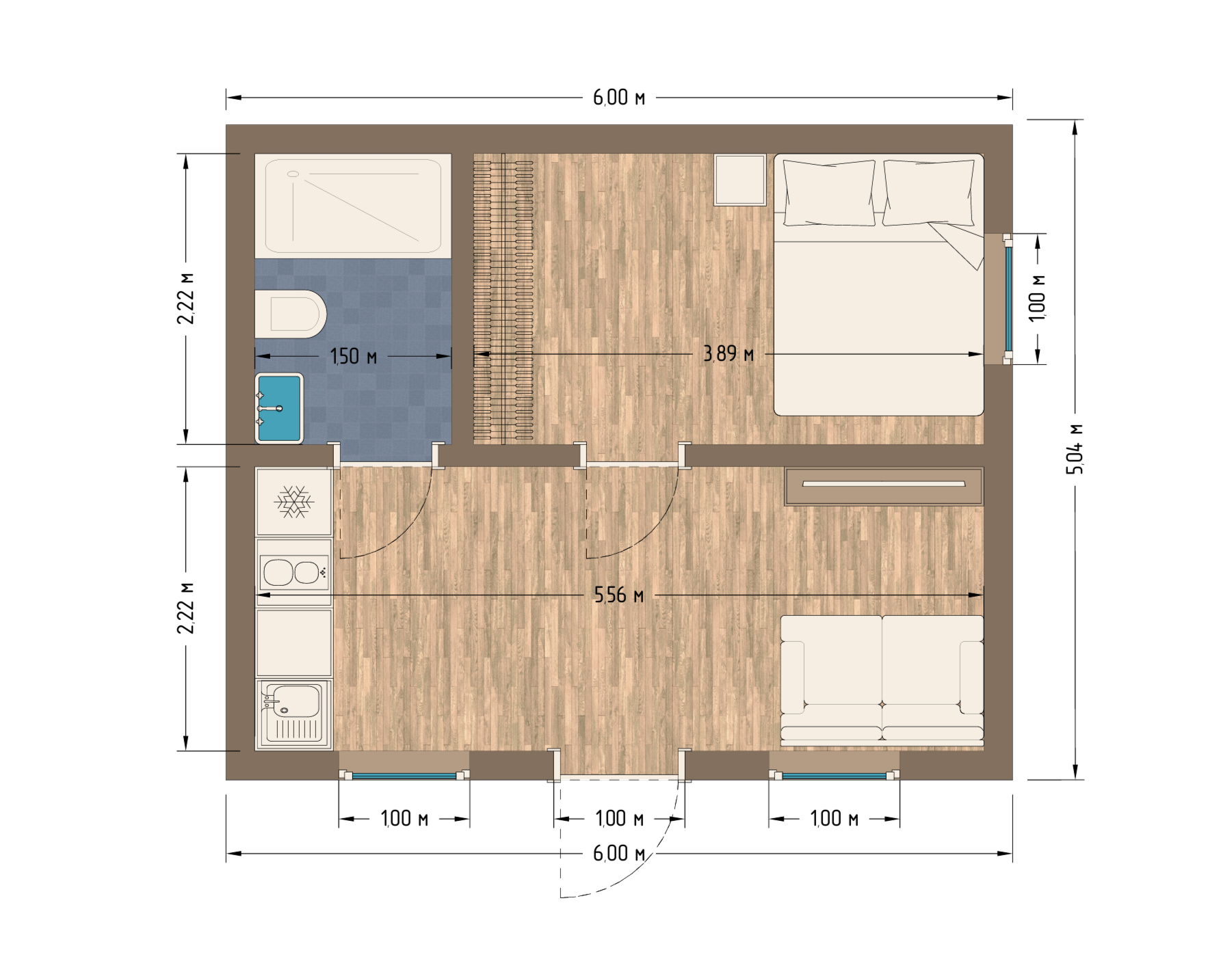 - Дополнительная перегородка с межкомнатной дверью под с/у, тамбур или комнату